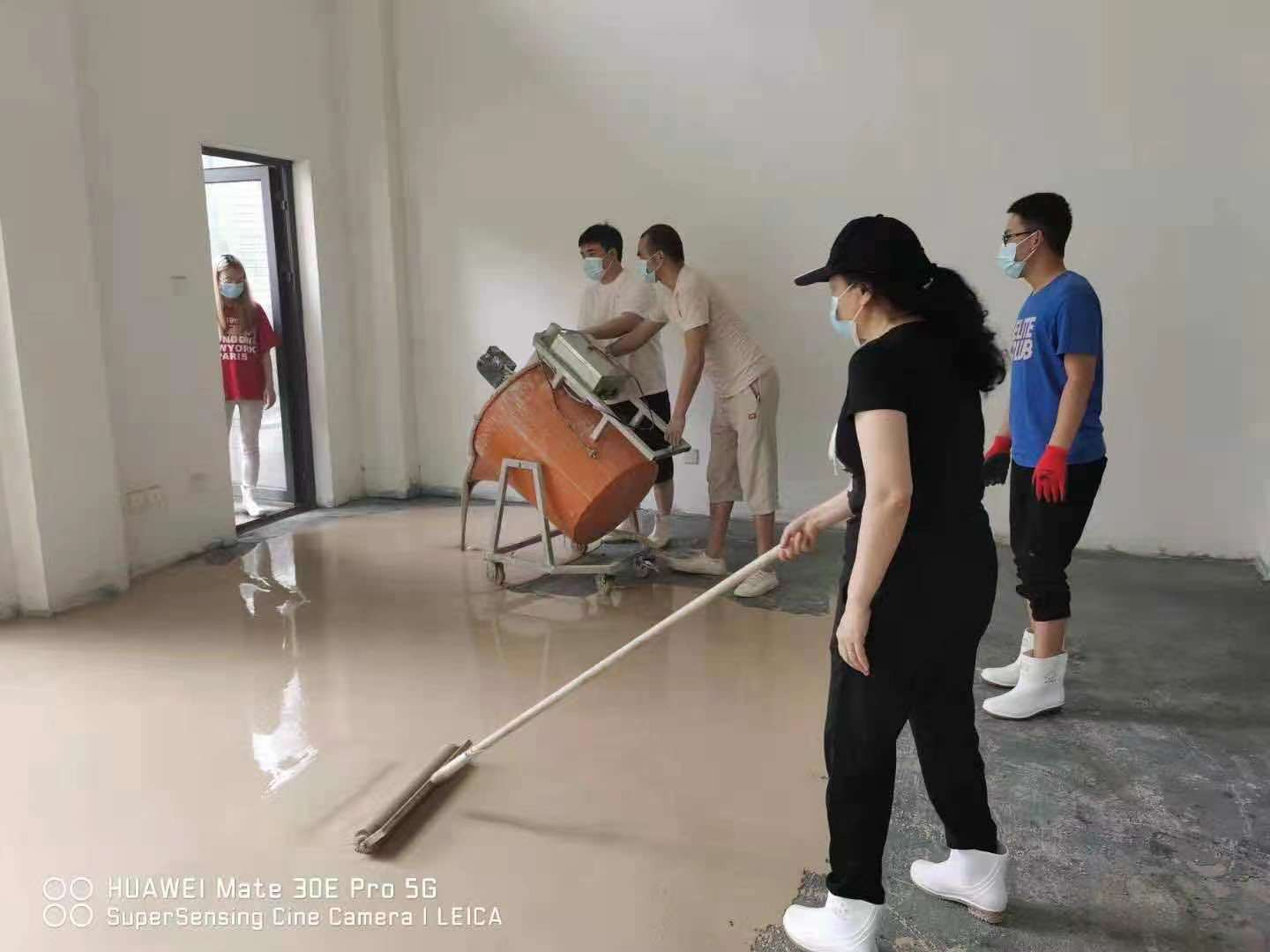 活動(dòng)開始,建材事業(yè)部部長(zhǎng)李茂春組織將到場(chǎng)員工分成兩班組施工,各司其職,各班組有序施工。將一定比例的石膏基自流平與水混入攪拌桶內(nèi),持續(xù)攪拌約3分鐘,一次性倒在地面上,自流平的流動(dòng)性好,產(chǎn)品可以根據(jù)地面的高低不平順勢(shì)流動(dòng),對(duì)地面進(jìn)行自動(dòng)找平,無需外力推動(dòng)。2個(gè)班組耗時(shí)不到8小時(shí),完成450㎡施工作業(yè),等待24小時(shí)后,地面即干燥可使用。我司自產(chǎn)“藍(lán)花楹”自流平產(chǎn)品具有品質(zhì)好,施工便捷高效的特點(diǎn)。