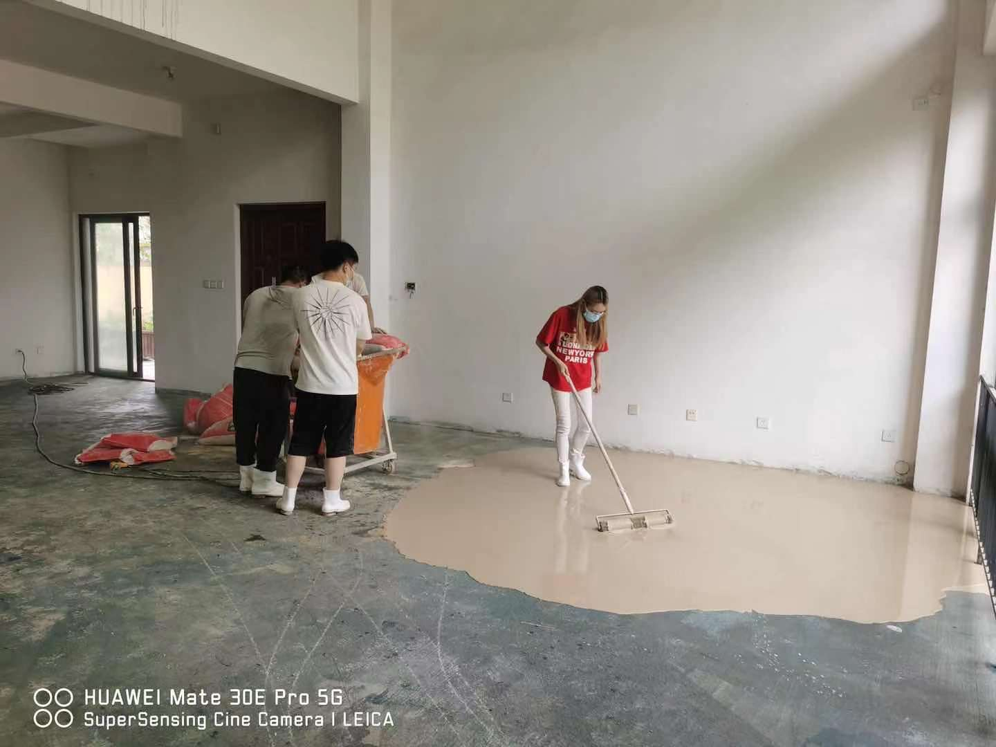 本次活動(dòng)地點(diǎn)為一棟5層樓的毛坯房,總面積約450㎡;顒(dòng)前期已將地面的沙塵和小石子清理干凈,并刷上一層界面劑,界面劑起到防水、封閉的作用,避免自流平流動(dòng)過程中失水過快,降低流動(dòng)性,或水分下滲形成氣泡針孔。